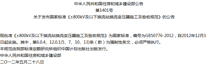 ±800kV及以下换流站换流变压器施工及验收规范收藏