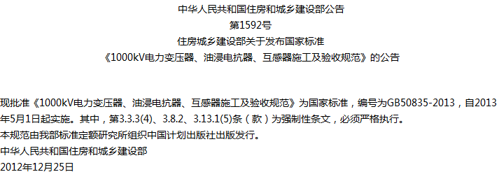 1000kV电力变压器、油浸电抗器、互感器施工及验收规范