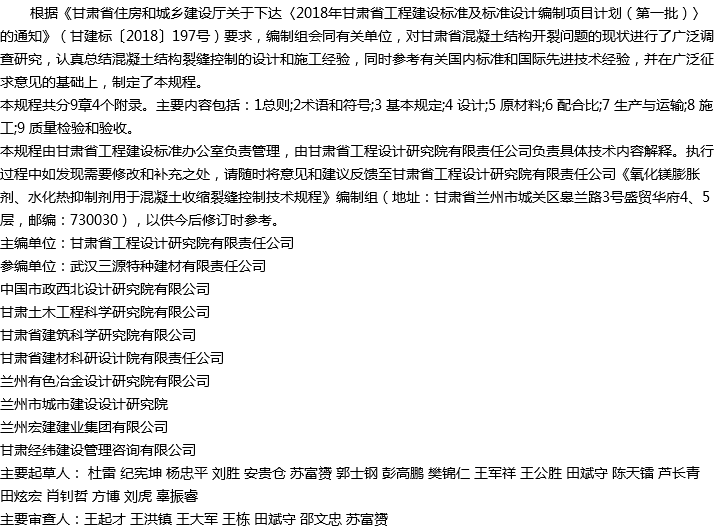 氧化镁膨胀剂、水化热抑制剂用于混凝土收缩裂缝控制技术规程收藏