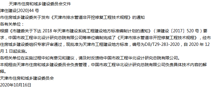天津市排水管道非开挖修复工程技术规程收藏