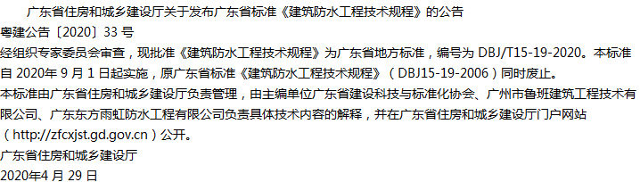 本规程由广东省住房与城乡建设厅负责管理,由广东省建设科技与标准化协会、广州市鲁班建筑工程技术有限公司和广东东方雨虹防水工程有限公司负责具体技术内容的解释。执行过程中如有意见或建议,请寄送广东省建设科技与标准化协会(地址:广州市先烈东路121号 邮编510500)。